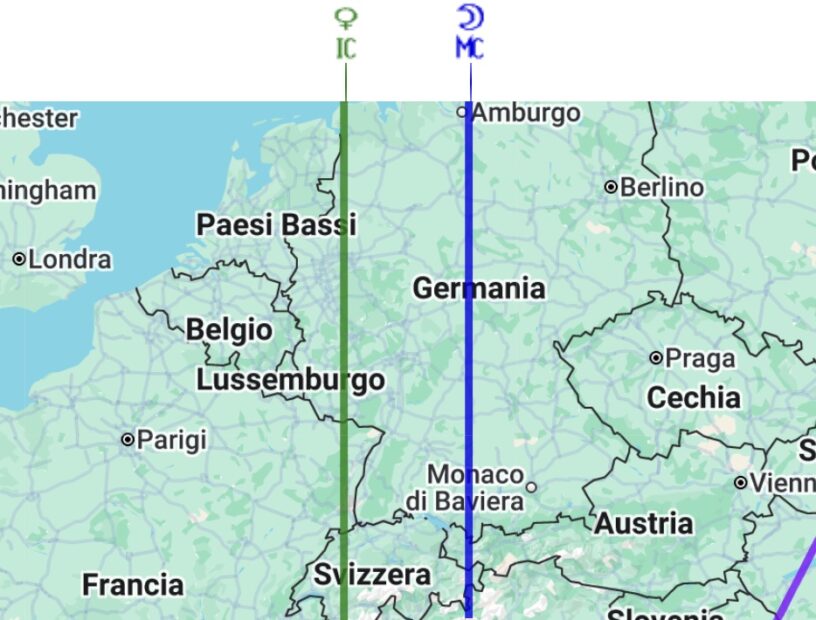Quando si osserva una mappa astrocartografica una delle domande più frequenti e naturali è questa: se mi sposto a est o a ovest di una linea il significato cambia? La risposta è sì, cambia. Il punto fondamentale, infatti, è che una linea astrocartografica si interpreta in rapporto al tema rilocato del luogo che stai considerando, cioè il grafico del Tema Natale calcolato per quella località mantenendo fisso il medesimo istante reale della nascita.